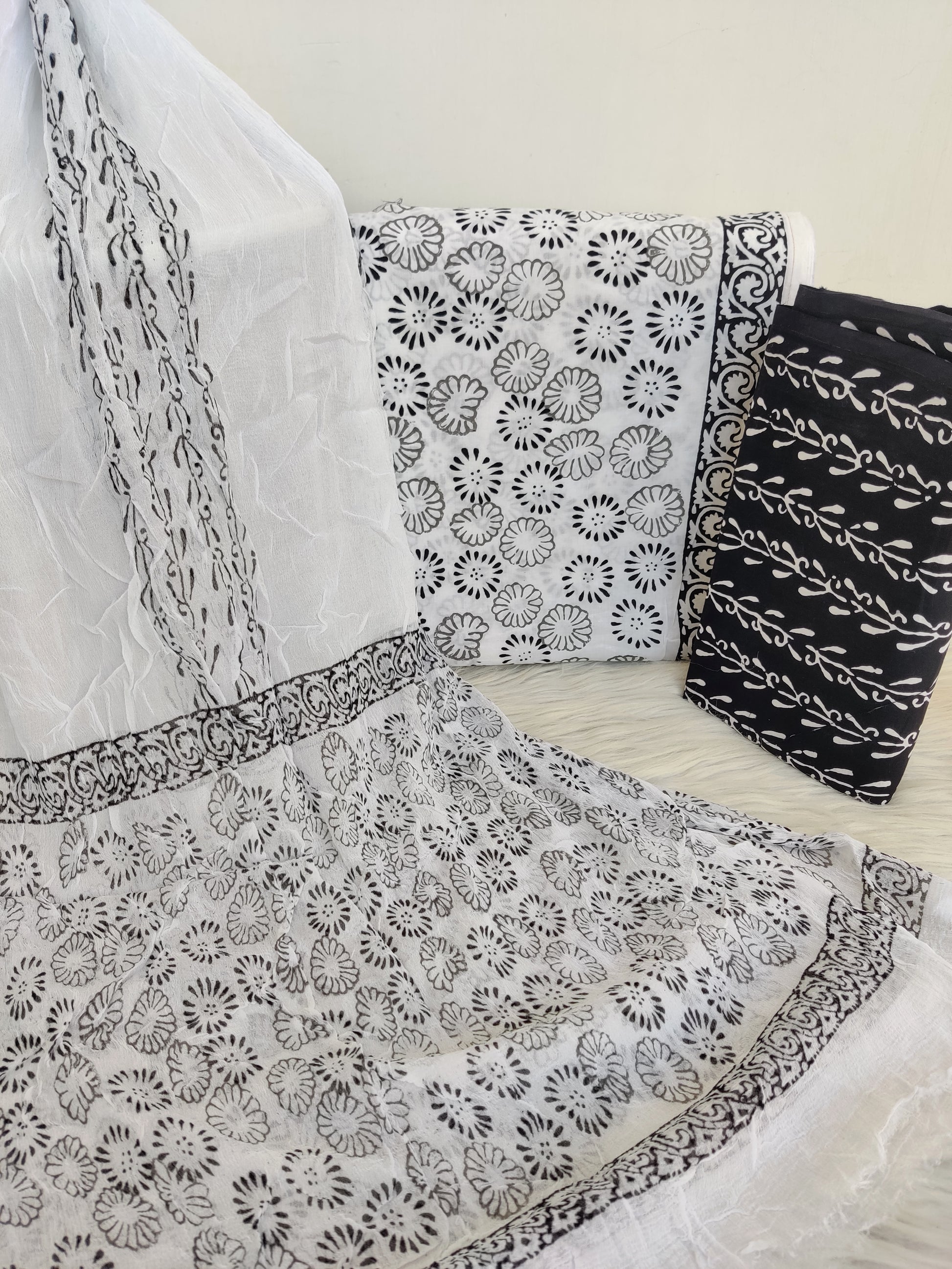 (Black & White) HAND BLOCK PRINTED COTTON SUIT WITH PURE CHIFFON DUPATTA
