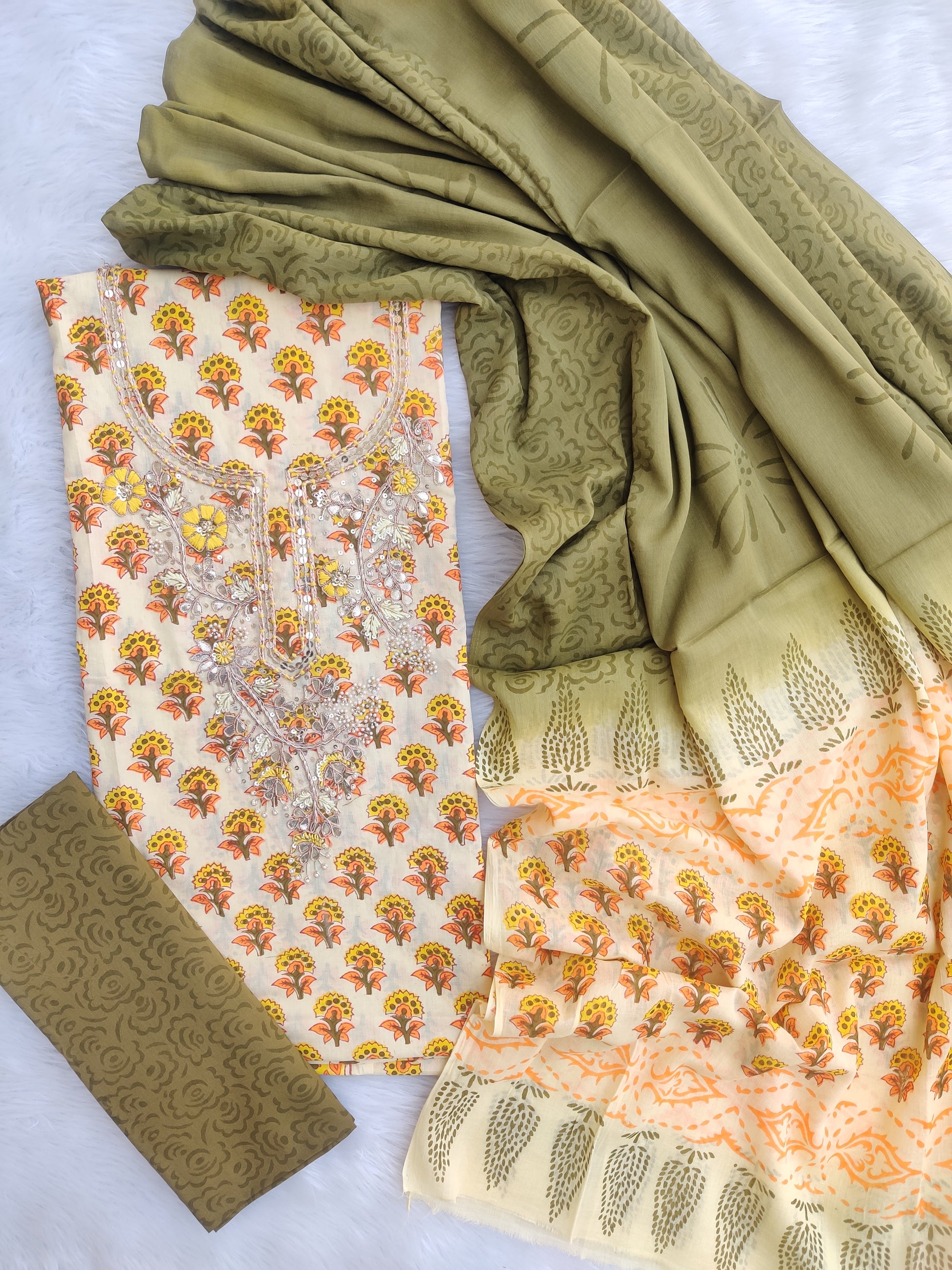 HAND BLOCK PRINTED UNSTITCHED GOTA PATTI SUIT WITH COTTON DUPATTA