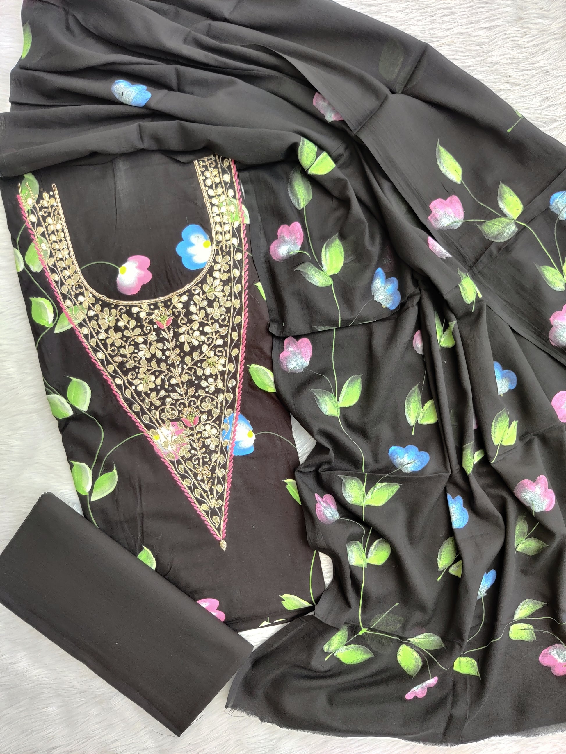 HAND BLOCK PRINTED UNSTITCHED GOTA PATTI SUIT WITH COTTON DUPATTA