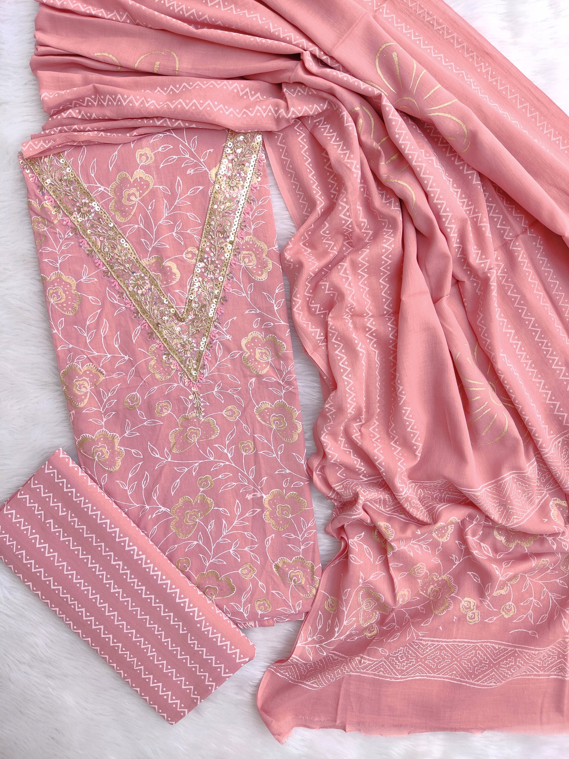 HAND BLOCK PRINTED UNSTITCHED GOTA PATTI SUIT WITH COTTON DUPATTA