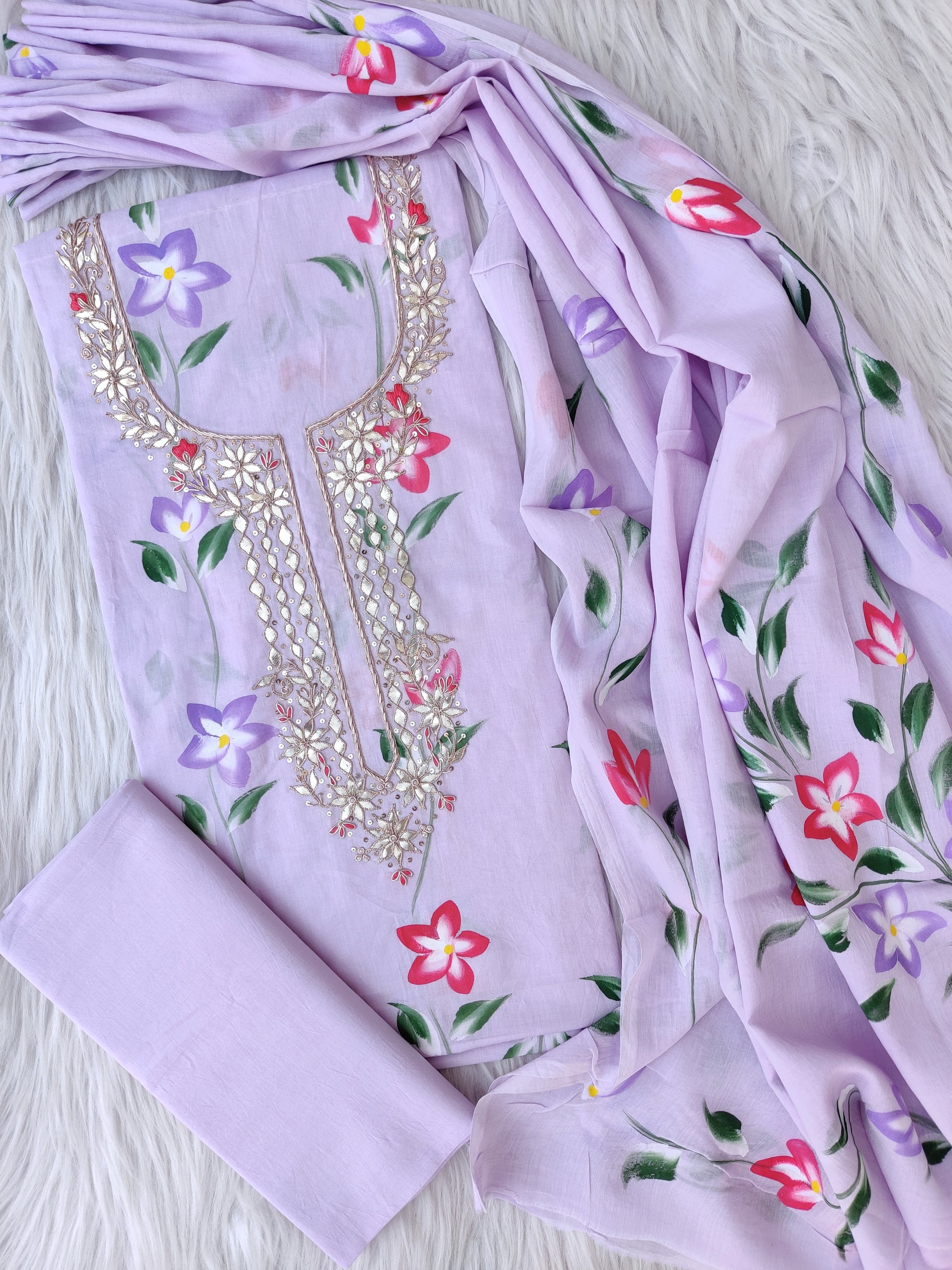 HAND BLOCK PRINTED UNSTITCHED GOTA PATTI SUIT WITH COTTON DUPATTA
