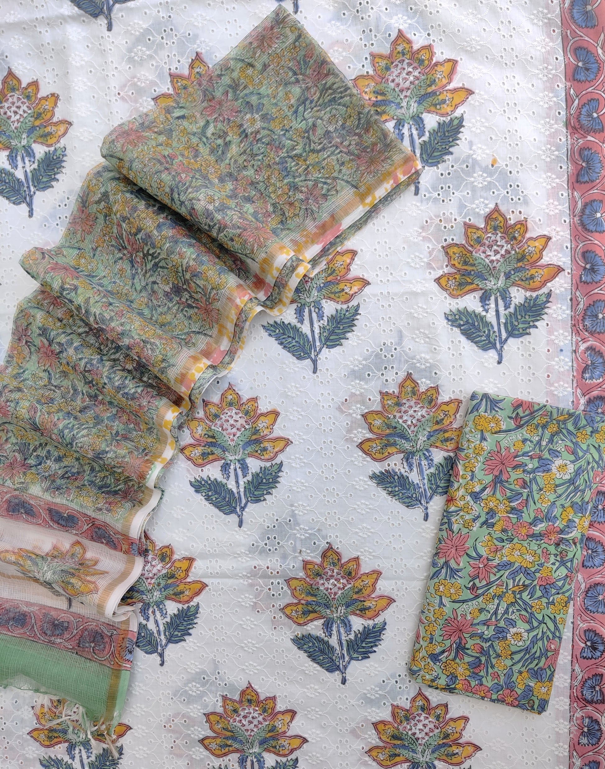 Hand Block Printed Cotton Schiffli Suit with Kota Doria Dupatta