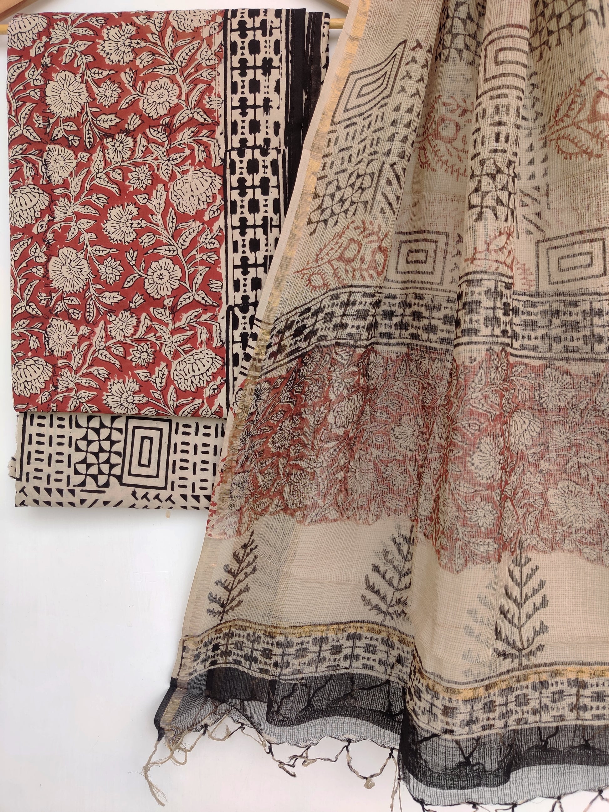 (KALAMKARI) Hand Block Printed Cotton Suit with Cotton Kota Doria dupatta2