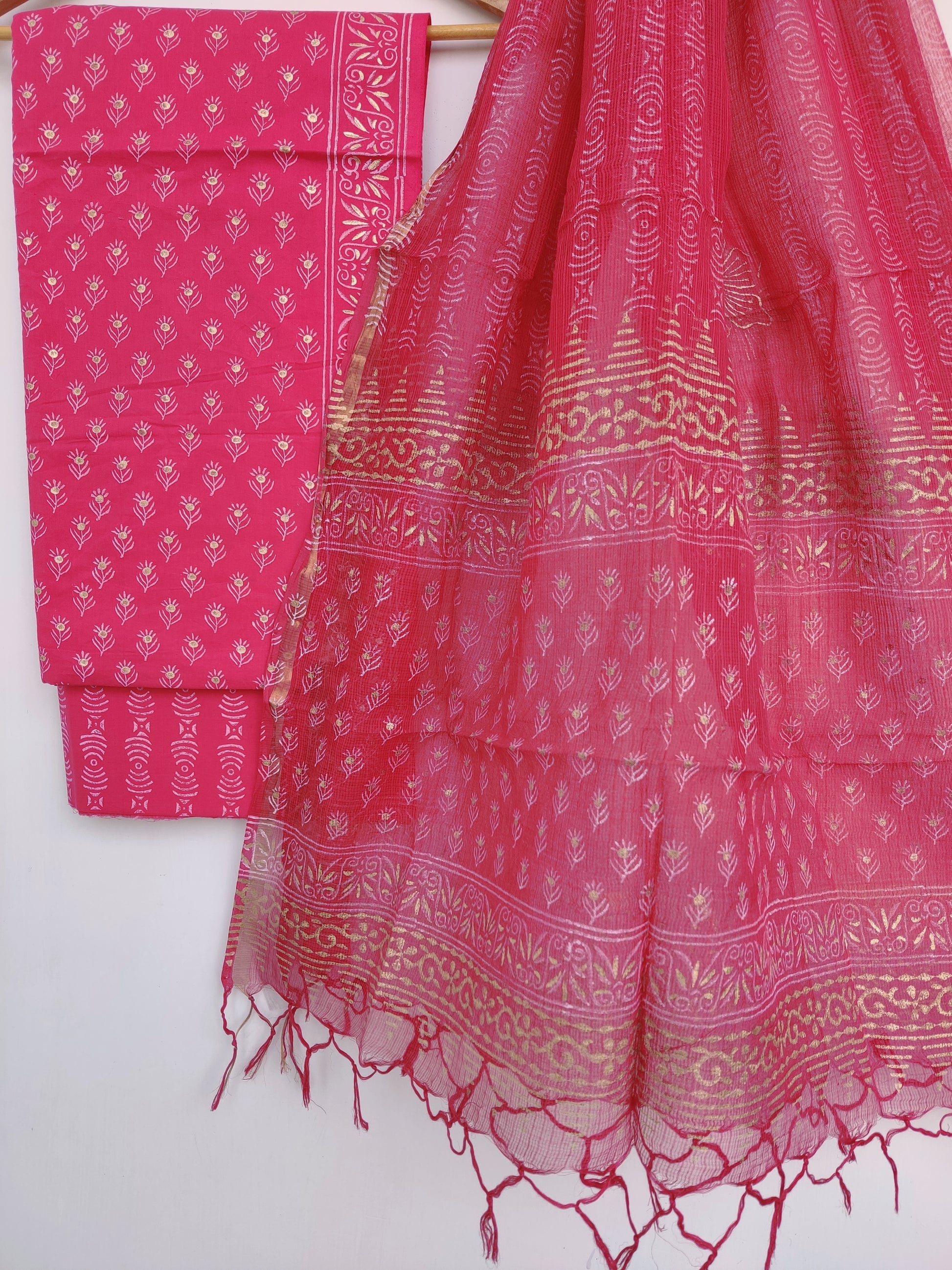 Hand Block Printed Cotton Suit with Cotton Kota Doria dupatta0