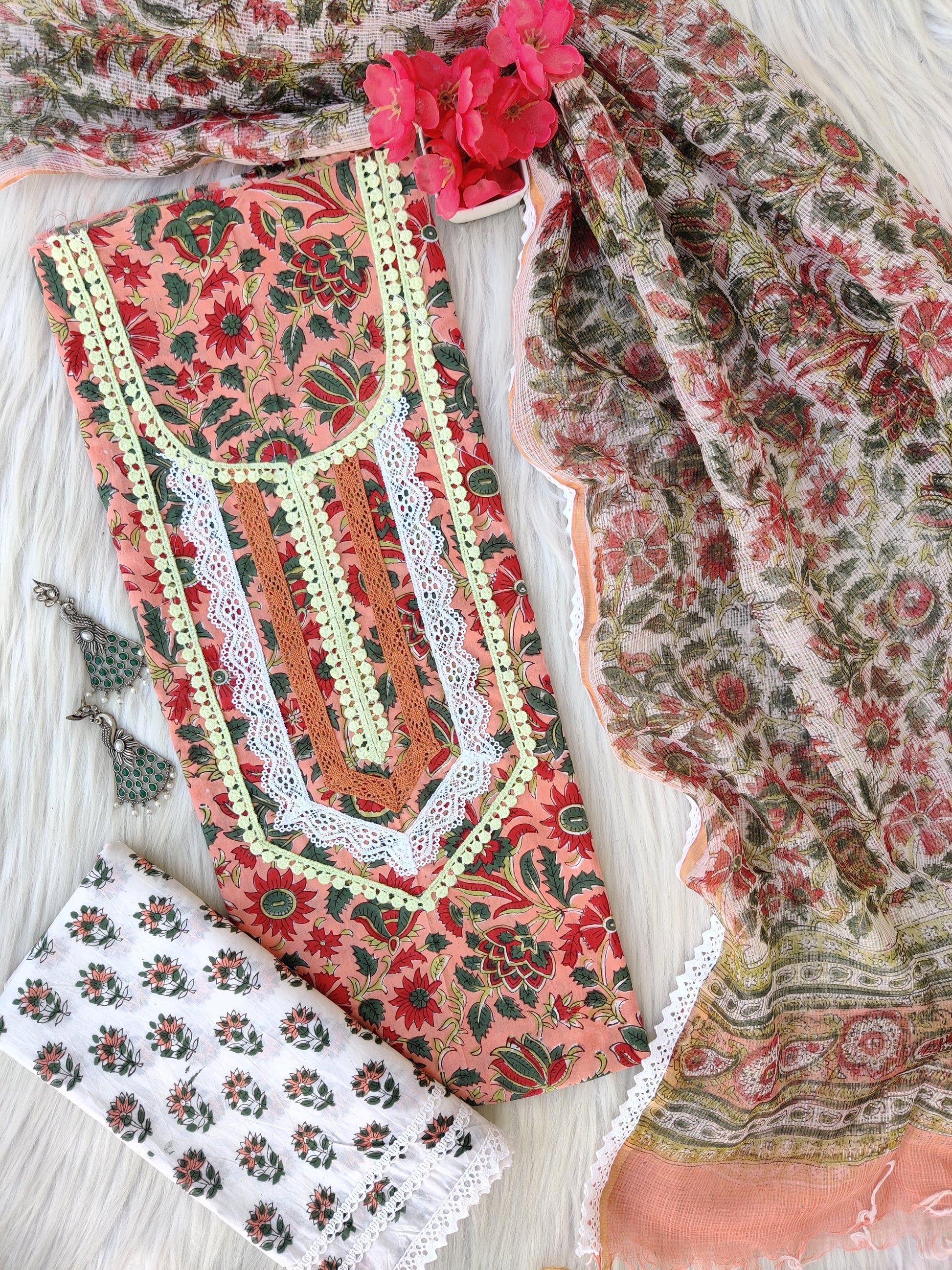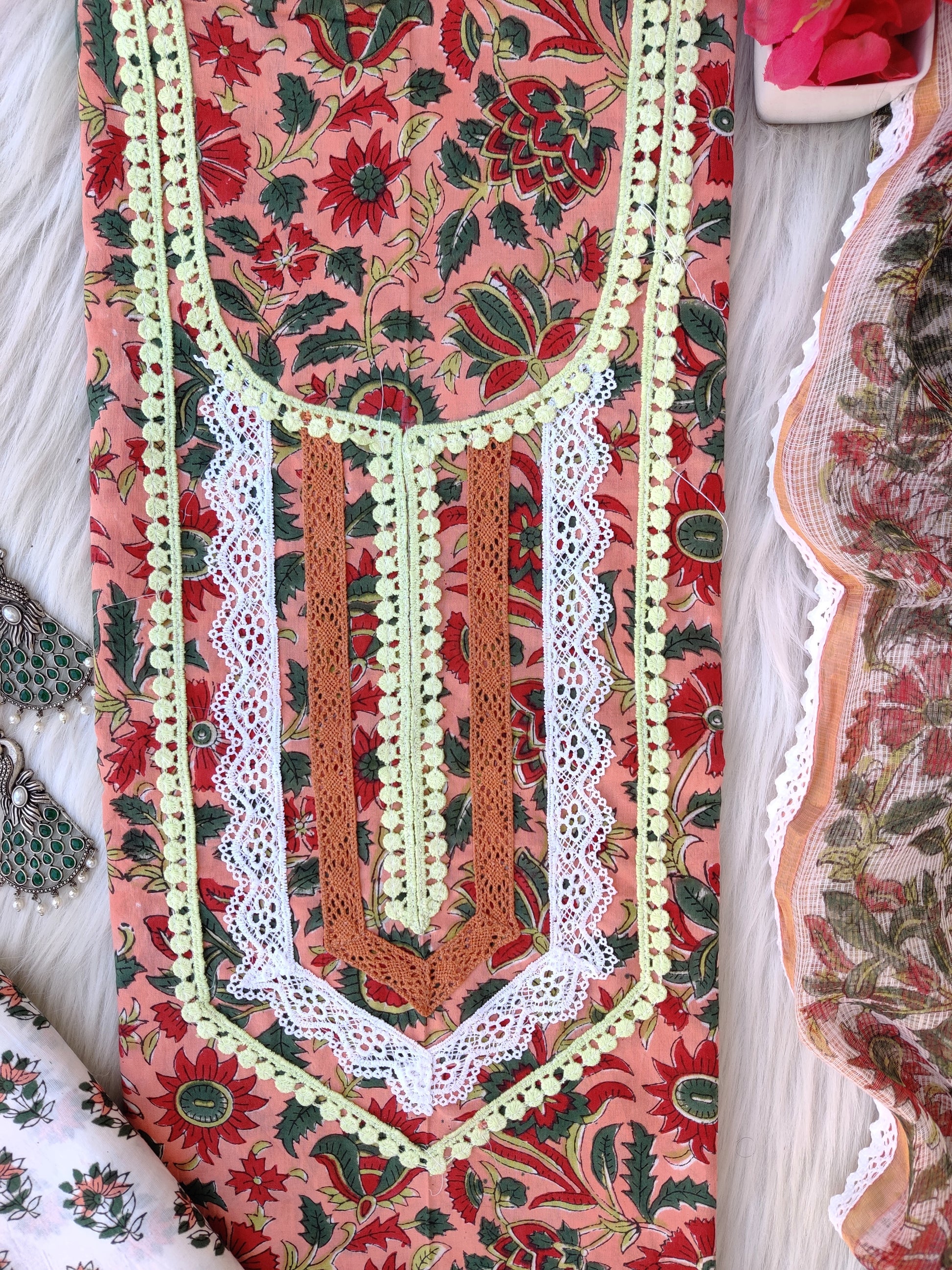 HAND BLOCK PRINTED CROCHET WORK SUITS WITH KOTA DORIA DUPATTA
