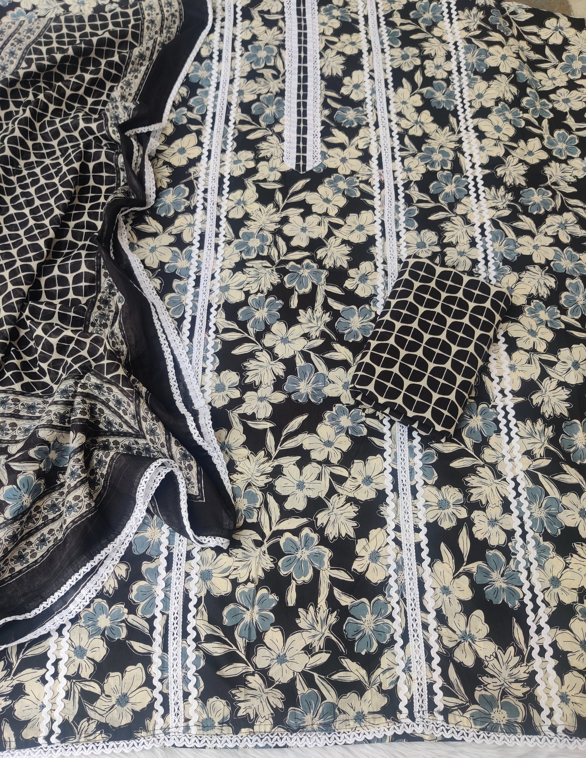 JAIPURI PRINTED CROCHET NECK WORK SUITS WITH MULMUL DUPATTA