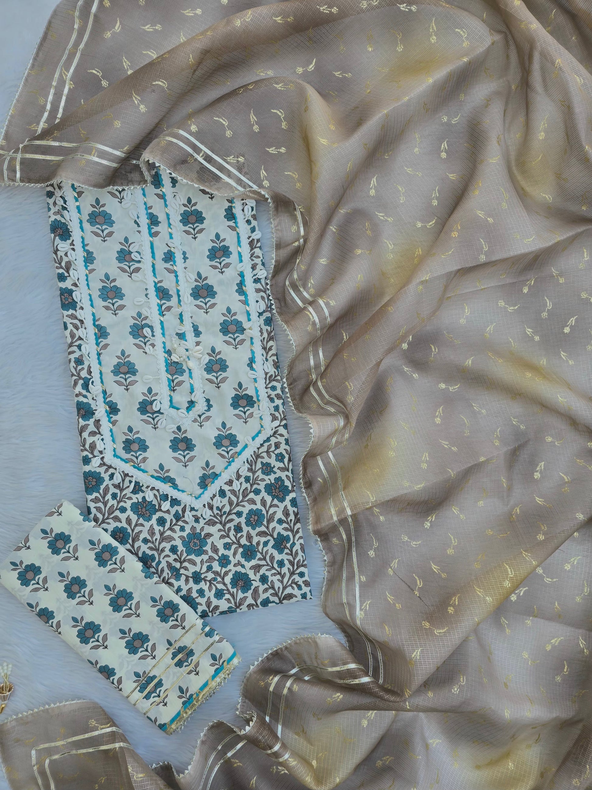 JAIPURI PRINTED GOTA LACE NECK WORK SUITS WITH KOTA DORIA DUPATTA