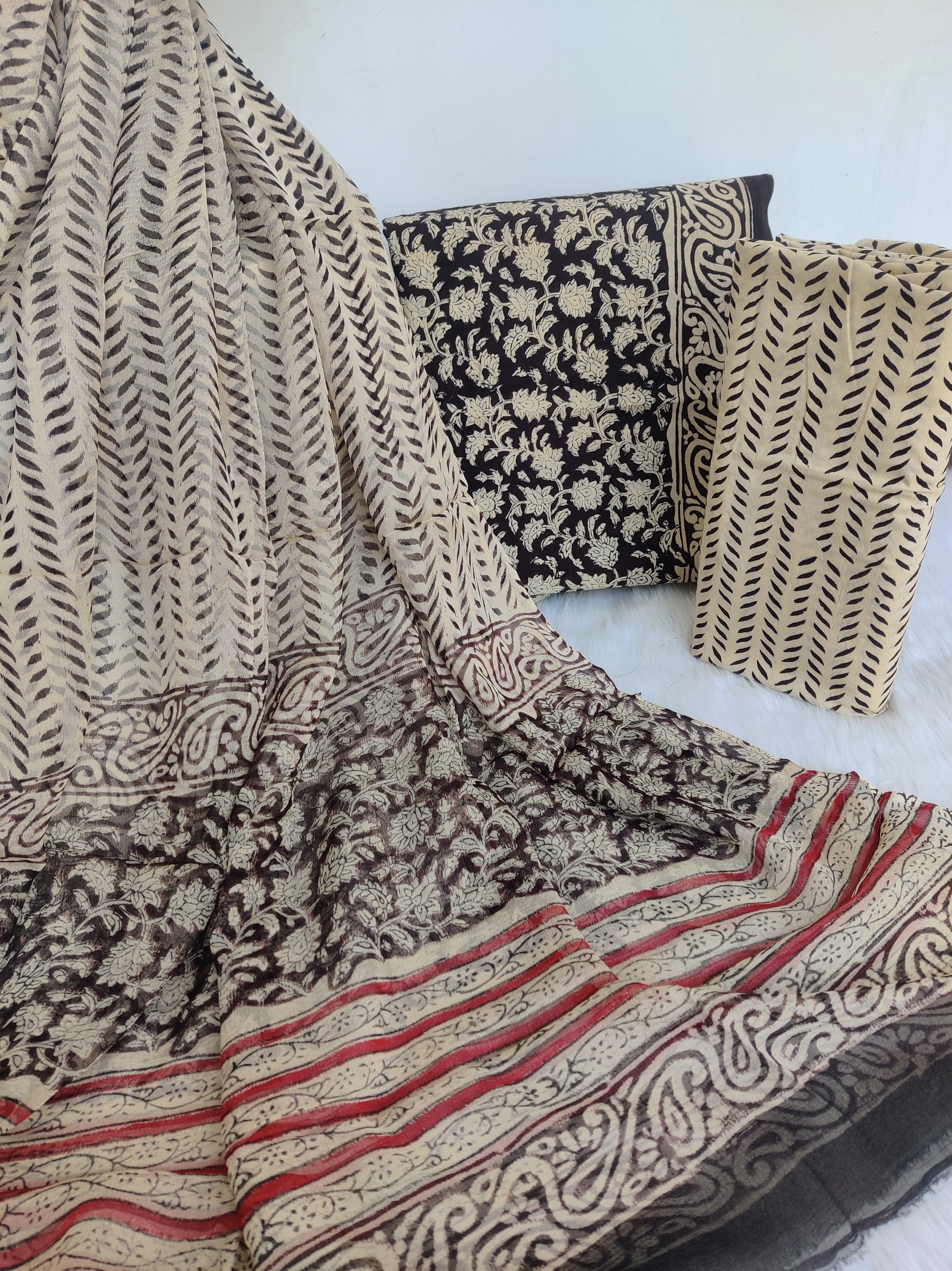 (KALAMKARI) HAND BLOCK PRINTED COTTON SUIT WITH PURE CHIFFON DUPATTA