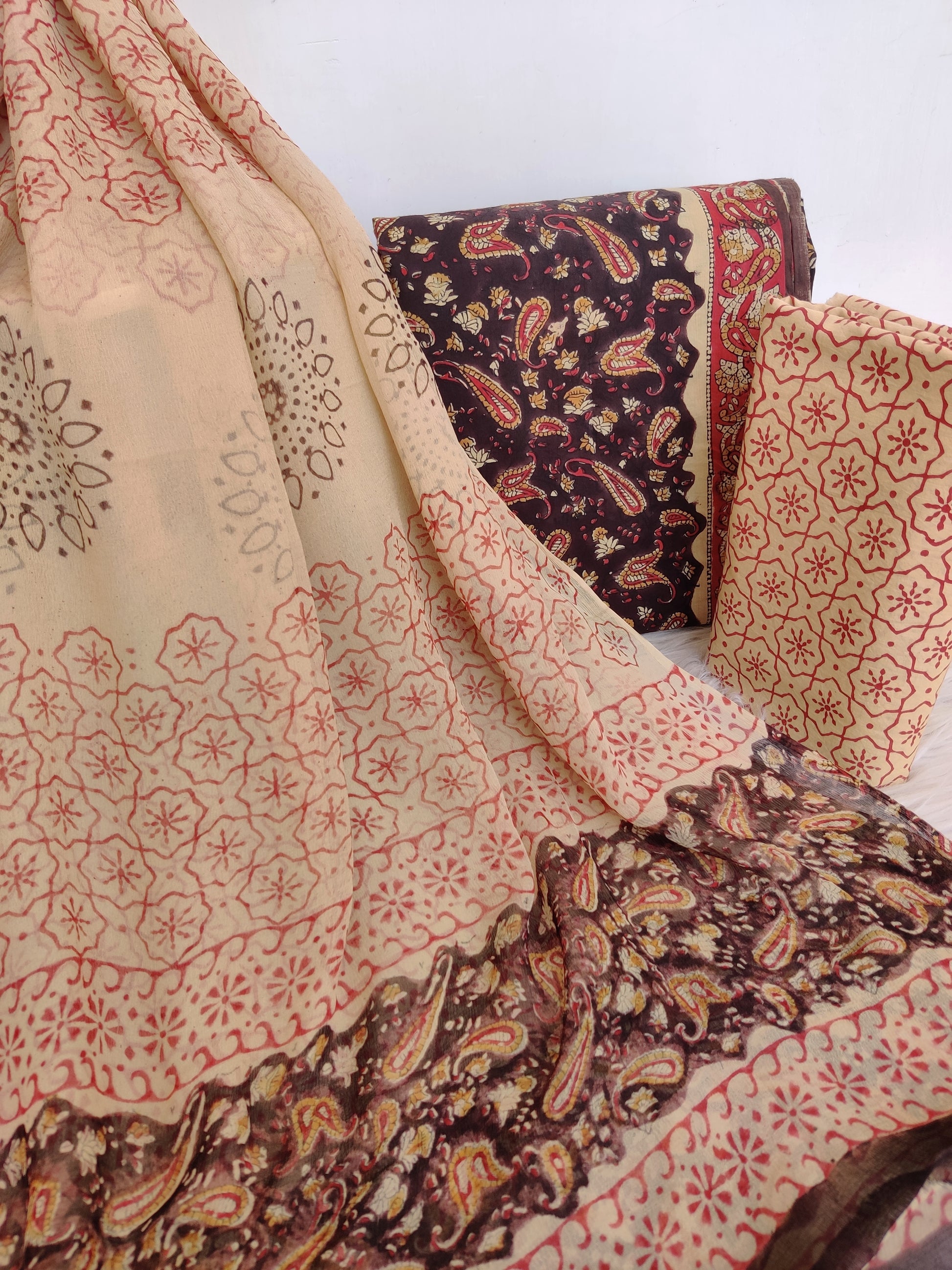 (KALAMKARI) HAND BLOCK PRINTED COTTON SUIT WITH PURE CHIFFON DUPATTA