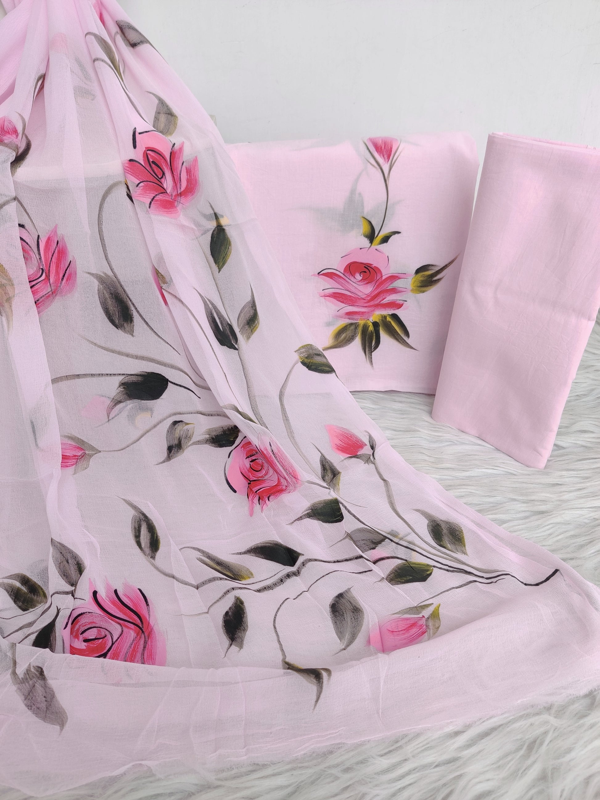 HAND PAINTED COTTON SUIT WITH PURE CHIFFON DUPATTA
