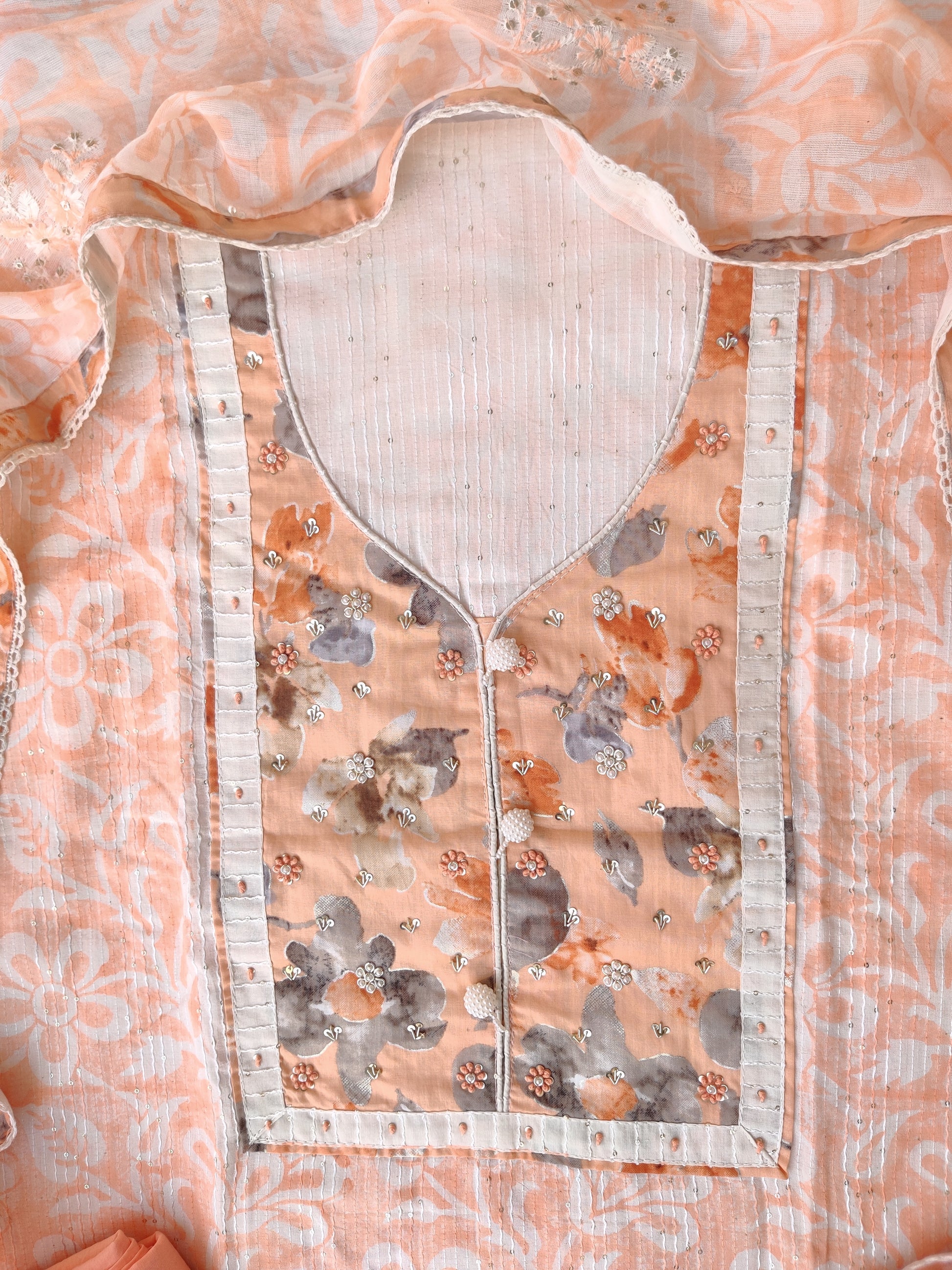 HAND BLOCK PRINTED UNSTITCHED NECK WORK SUIT WITH COTTON DUPATTA