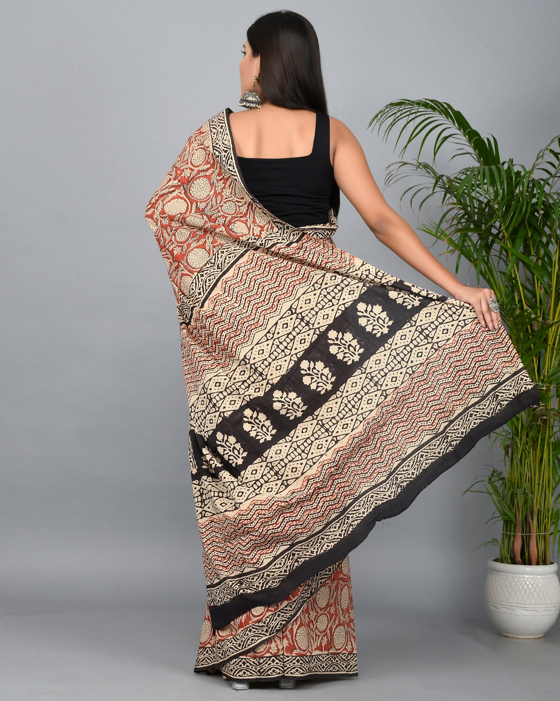 Bagru Kalamkari Printed Cotton Mulmul Saree with Blouse Piece