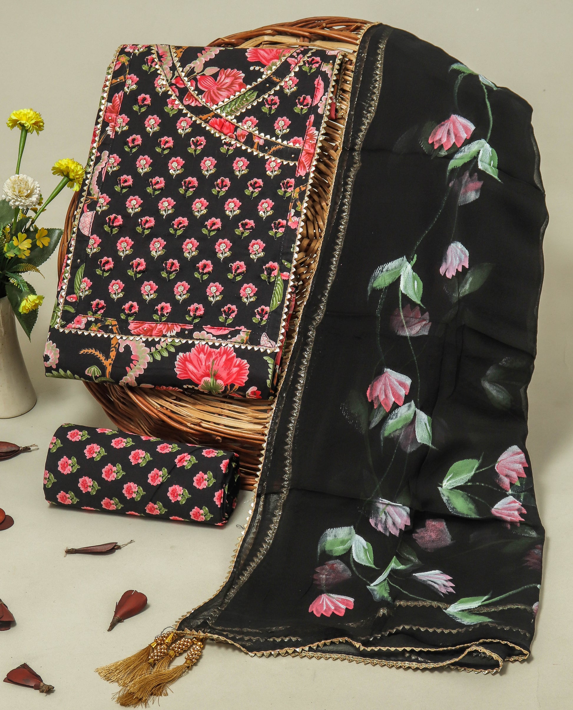 Cotton Printed Neck Work Suits with Chiffon dupatta