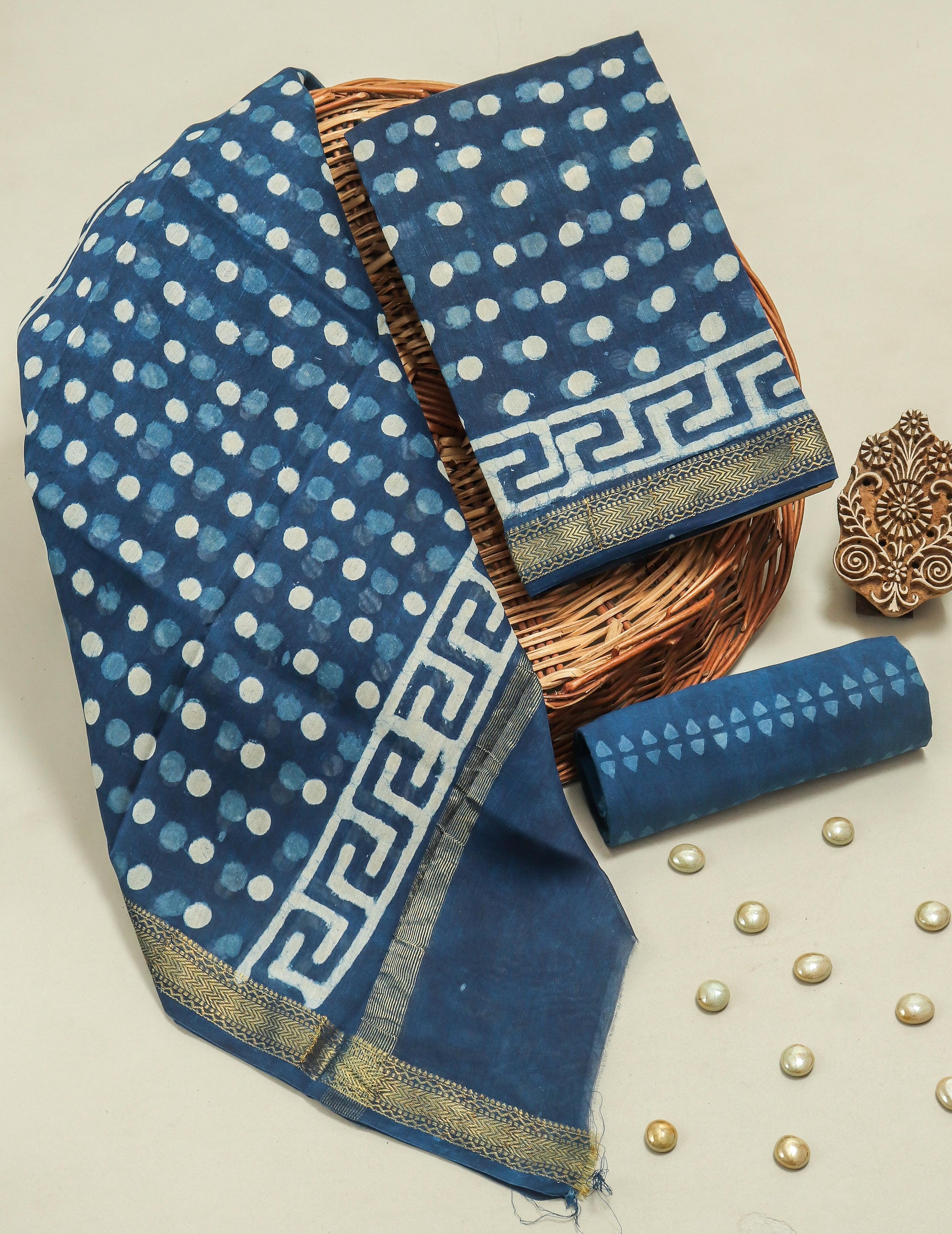 Indigo Blue Hand Block Printed Maheshwari Silk Suit with Maheshwari Silk Dupatta