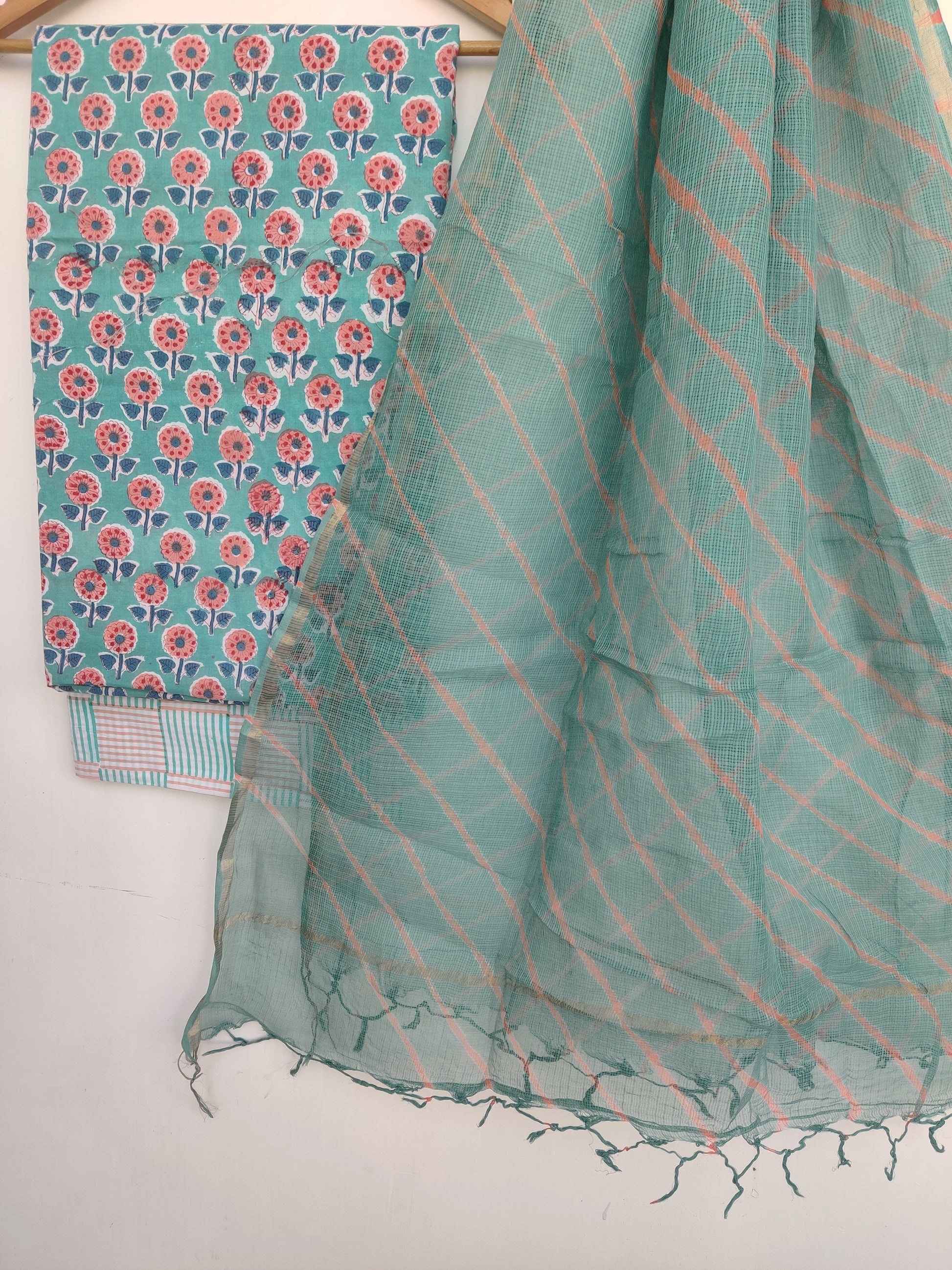 (SALE) Hand Block Printed Cotton Suit with Cotton Kota Doria dupatta